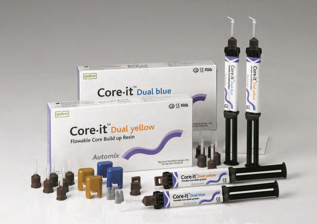 Composite tái tạo cùi Core It Dual là composite cao cấp của Spident dùng trong việc tạo cùi và gắn chốt post đem đến khả năng mài cắt như mô ngà thật. Nhằm đảm bảo cho việc loại bỏ, mài dũa vật liệu một cách có kiểm soát và đảm bảo việc sửa soạn viền một cách chính xác. Tính chất của vật liệu tái tạo cùi Core It Dual giúp nha sĩ kiểm soát tối ưu khi sử dụng mũi mài. Tại các điểm chuyển tiếp từ ngà răng sang khu vực vật liệu Core It Dual, chúng ta cực kỳ khó để phân biệt được sự khác biệt. Vật liệu này giúp cho việc chuẩn bị mà không cần mài rãnh đánh dấu cũng như undercut nào. Điều kiện lý tưởng này giúp cho các kỹ thuật viên nha khoa thực hiện công việc của họ một cách chính xác.